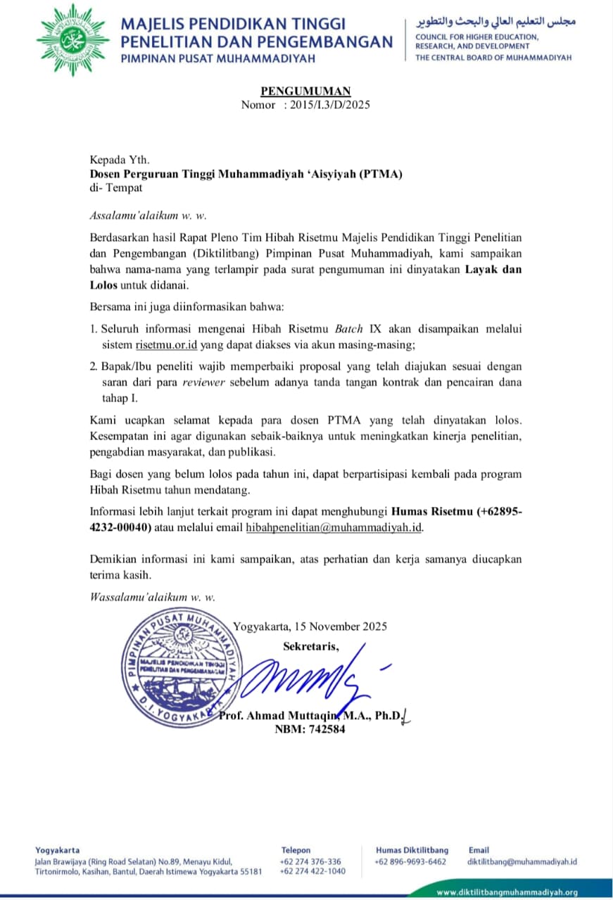 Universitas Muhammadiyah Banten kembali menorehkan prestasi membanggakan melalui keberhasilan dua dosennya dalam meraih pendanaan Hibah RisetMu Batch XI yang diumumkan oleh Majelis Pendidikan Tinggi Penelitian dan Pengembangan (Diktilitbang) Pimpinan Pusat Muhammadiyah. Pengumuman resmi tersebut tercantum dalam surat bernomor 2015/I.3/D/2025 yang dirilis pada 15 November 2025.